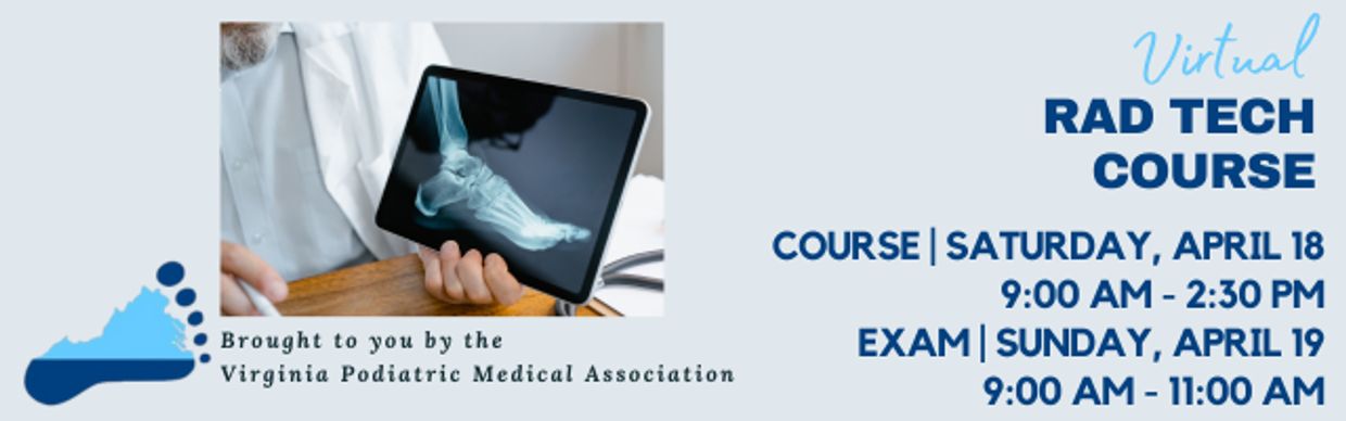 The purpose of this course is to certify individuals to complete X-rays in a safe and effective manner. The process includes course attendance, a written examination, and documentation of completion of 20 foot and 20 ankle X-rays assisted by the practitioner. Upon completion, individuals are instructed to seek licensure with the Virginia Board of Medicine as a Radiologic Technologist-limited.